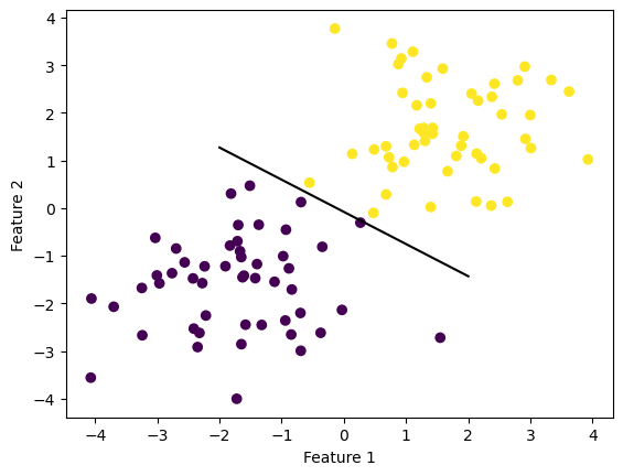 import numpy as npimport pandas as pdimport seaborn as snsfrom matplotlib import pyplot as pltfrom perceptron import Perceptronfrom sklearn.datasets import make_blobs, make_circlesnp.random.seed(12345)X, y = make_blobs(n_samples =100, n_features =2, centers = [(-1.7, -1.7), (1.7, 1.7)])p = Perceptron()p.fit(X, y, max_steps =1000)def draw_line(w, x_min, x_max): x = np.linspace(x_min, x_max, 101) y =-(w[0]*x + w[2])/w[1] plt.plot(x, y, color ="black")fig = plt.scatter(X[:,0], X[:,1], c = y)fig = draw_line(p.w, -2, 2)xlab = plt.xlabel("Feature 1")ylab = plt.ylabel("Feature 2")