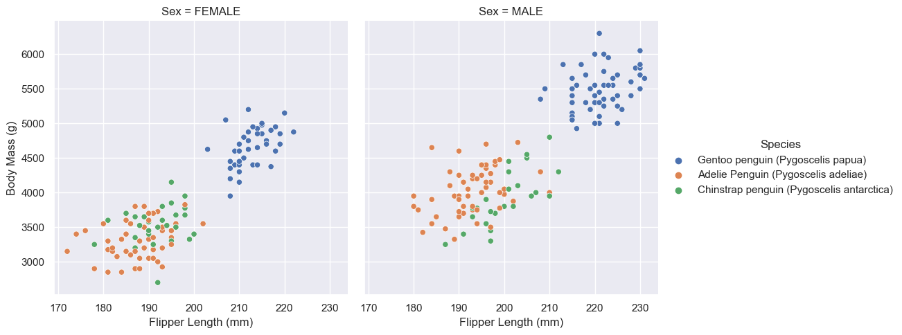 x="Flipper Length (mm)", y="Body Mass (g)", col="Sex",